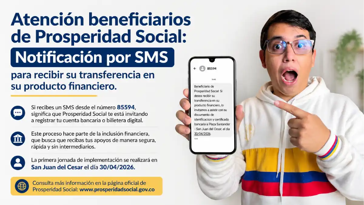 Estos mensajes, enviados desde el número oficial 85594, notificación por SMS, invitan a los beneficiarios a asistir a ciertos puntos de atención, como la Plaza Santander en San Juan del Cesar, el próximo 30 de abril de 2026, con su documento de identificación y certificado bancario.